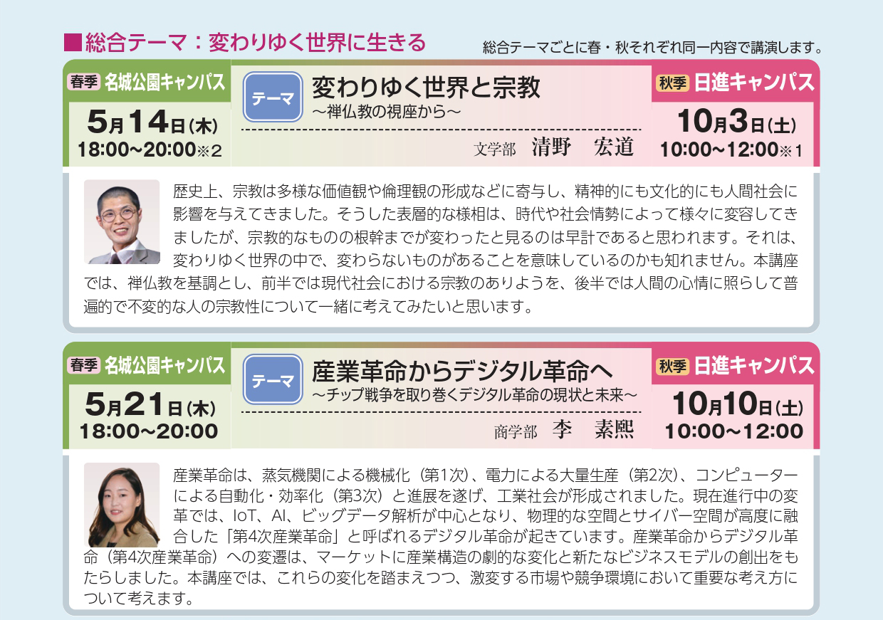 愛知学院大学公開講座は「大学における研究の成果を社会に還元するとともに、本学のもつ機能を広く社会に開放して生涯学習社会の要請に応え、大学の社会的使命を果たすことを目的」に企画しております。 名城公園キャンパスの2026年度春季公開講座の総合テーマは「変わりゆく世界に生きる」です。 奮ってご参加ください。