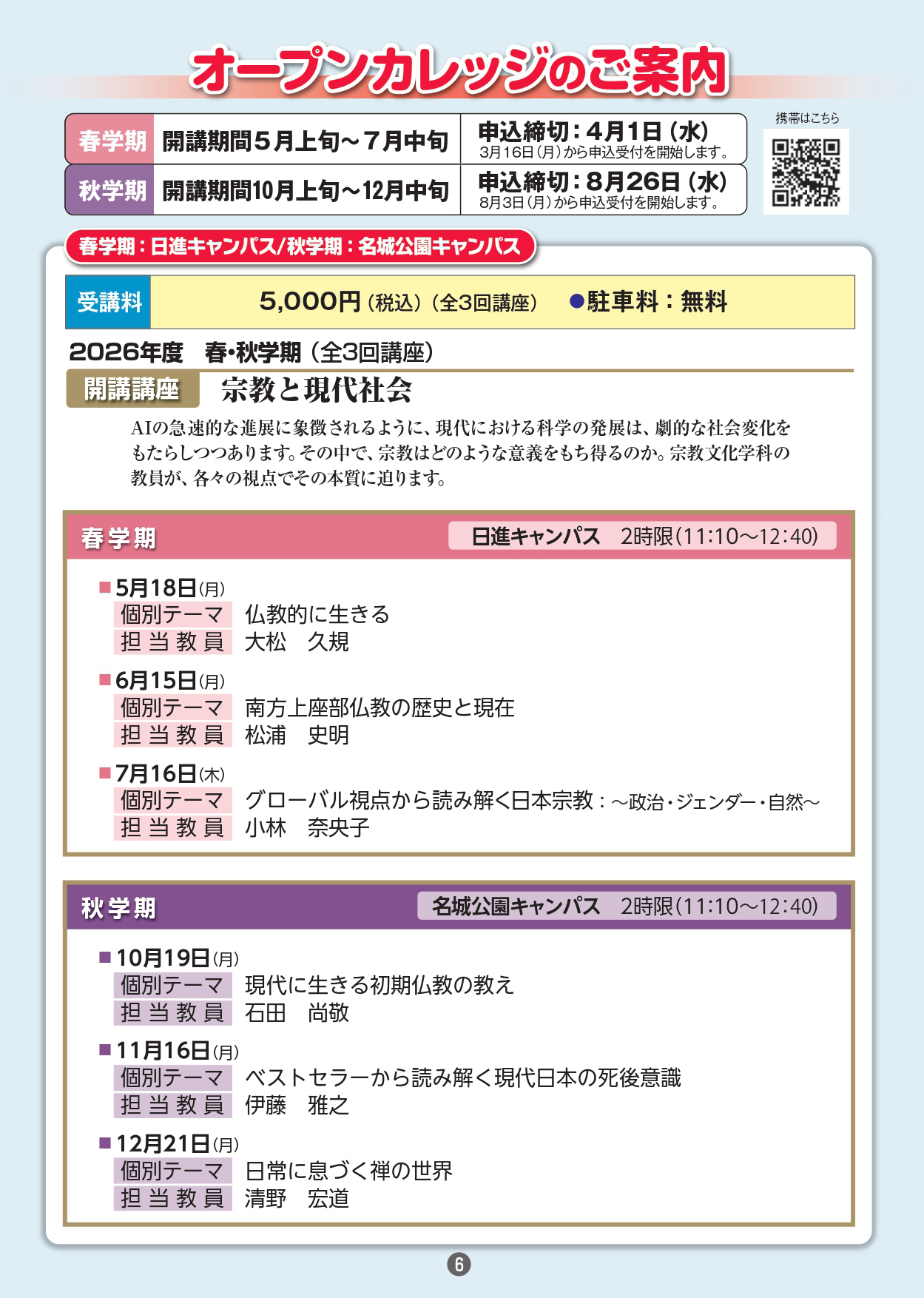 愛知学院大学公開講座は「大学における研究の成果を社会に還元するとともに、本学のもつ機能を広く社会に開放して生涯学習社会の要請に応え、大学の社会的使命を果たすことを目的」に企画しております。 日進キャンパスの2026年度春季公開講座の総合テーマは「今日から使える生きる知恵」です。 奮ってご参加ください。
