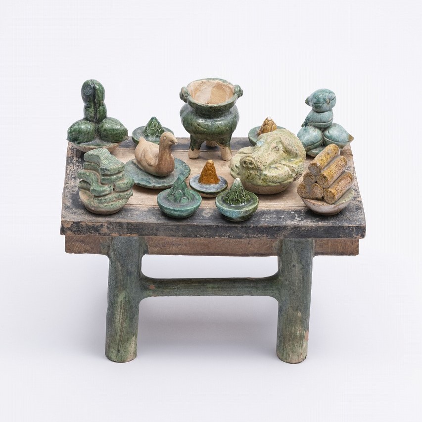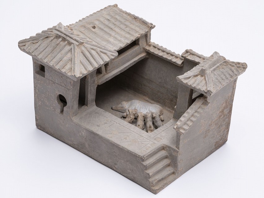 中国古代の墳墓には、家屋、井戸、豚小屋付きのトイレ、カマドや家具など建物や生活用品をかたどった、建築明器(めいき)と呼ばれる陶製のミニチュア模型が副葬品として埋葬されていました。死者は現世の延長となる世界で生き続けると考えられていたため、来世でも不自由なく幸せに暮らせるようにと、生前の日常にあった、今でいう住宅設備機器や生活様式などがやきもので再現されたのです。大きさも素材も実際とは異なり実用性は失われていますが、理想の暮らしを祈る思いが表出し、素朴ながらも写実的で生き生きとしています。
