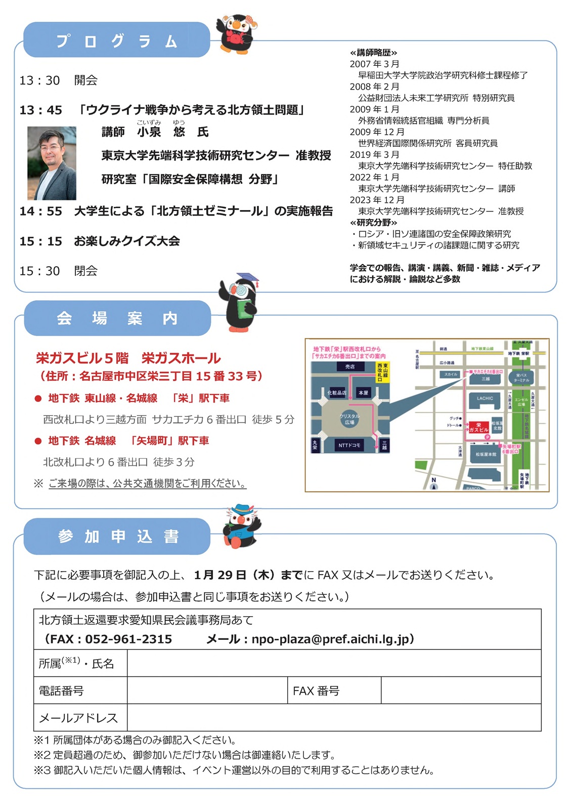 北方領土返還要求愛知県民会議では、2月7日の「北方領土の日」の関連事業として、県民の北方領土問題に対する理解と関心をより深めていただくために、2月1日(日)に「北方領土の返還を求める県民のつどい」を下記のとおり開催します。