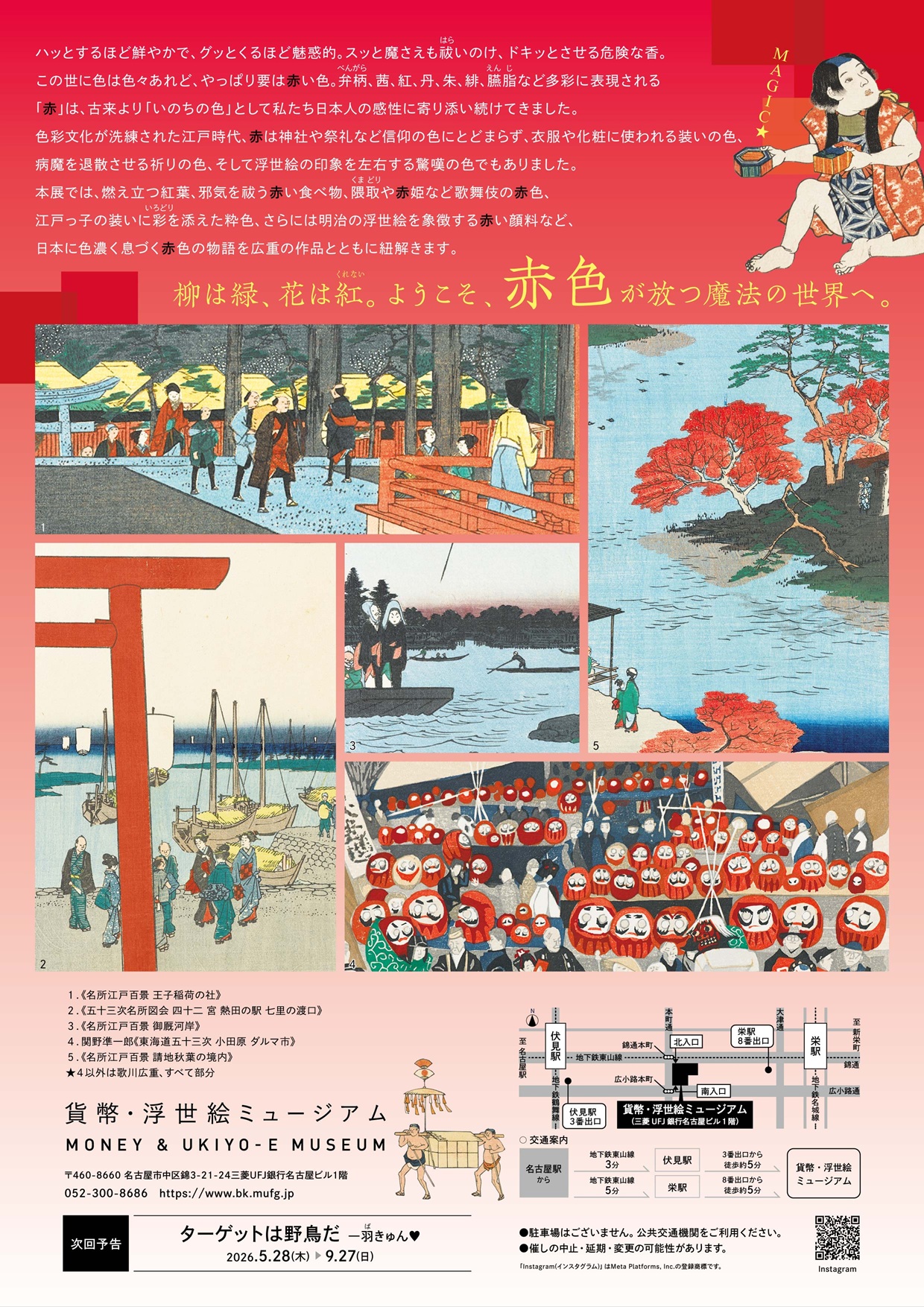 本展では、燃え立つ紅葉、邪気を祓う赤い食べ物、隈取や赤姫など歌舞伎の赤色、江戸っ子の装いに彩を添えた粋色、さらには明治の浮世絵を象徴する赤い顔料など、日本に色濃く息づく赤色の物語を広重の作品とともに紐解きます。