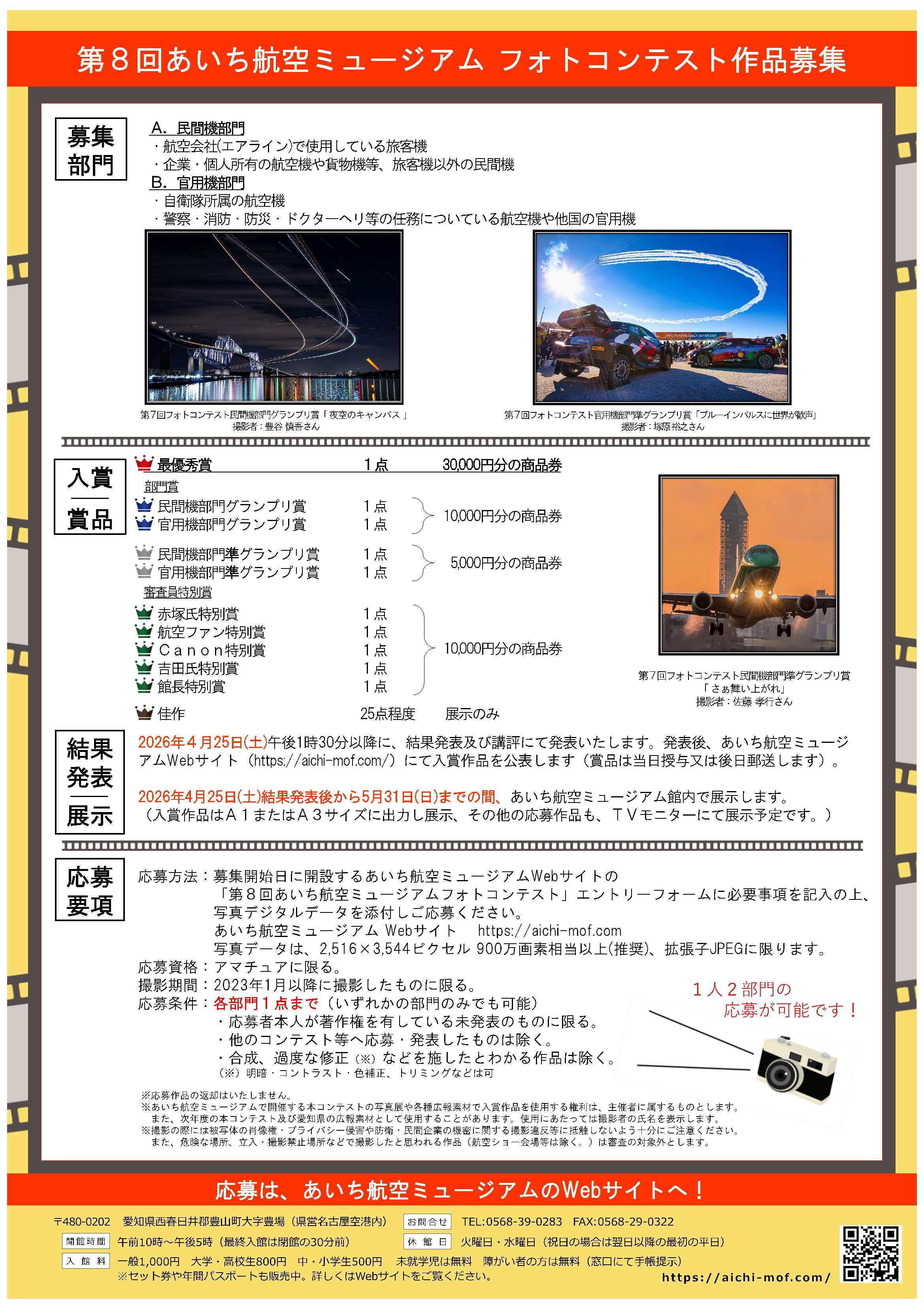 ※第8回あいち航空ミュージアムフォトコンテスト作品募集期間 2026年 4月 25日(土) 午後1時30分から午後3時まで