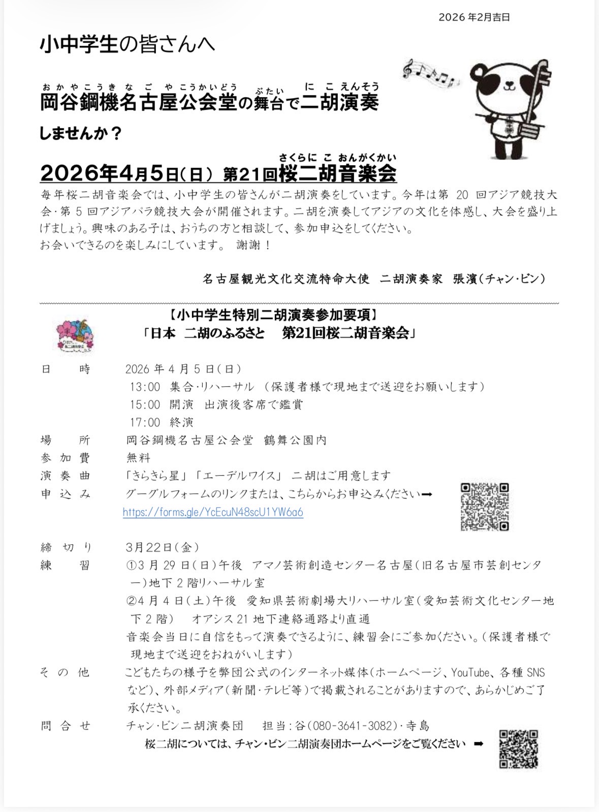 4月5日(日)岡谷鋼機名古屋公会堂で開催する第21回桜二胡音楽会での小中学生特別二胡演奏の参加募集です。