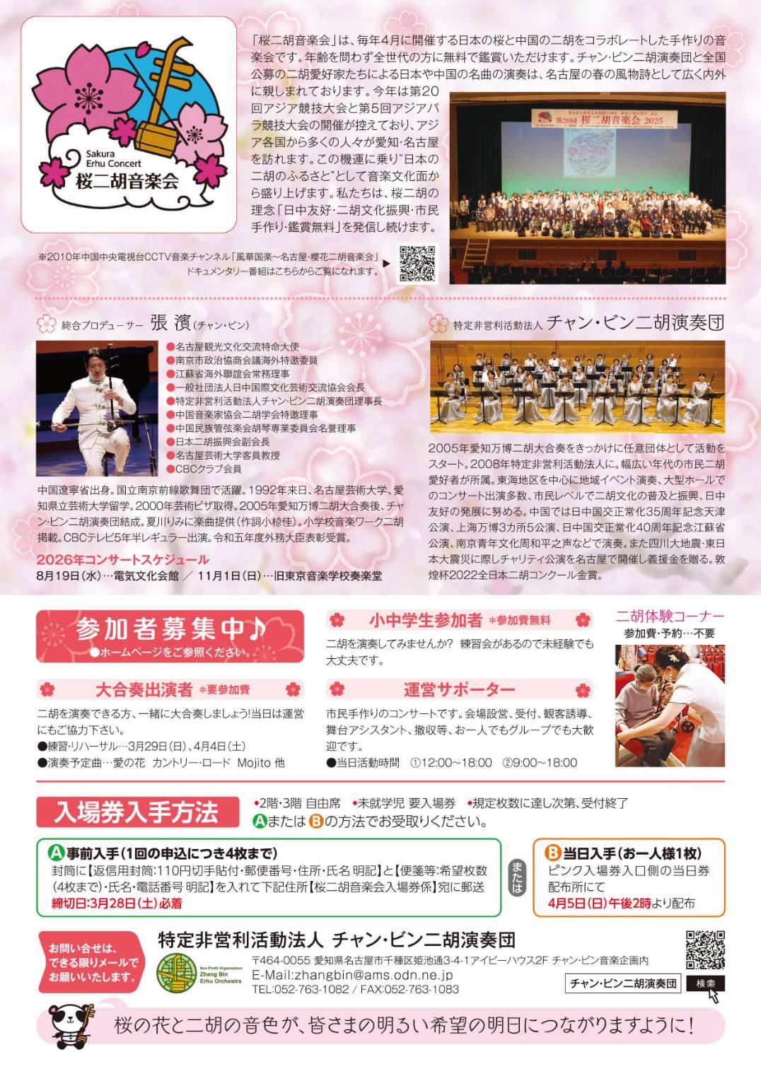 桜二胡音楽会は、日本の「桜」と中国の伝統楽器「二胡」をコラボレートし、日中文化交流を目的として2006年より徳川園で開催してきました。今年で第21回を迎えます。第15回からは岡谷鋼機名古屋公会堂(鶴舞公園内)を会場に、日中友好、二胡文化の振興、市民手作り、鑑賞無料の理念を大切に継承し開催しています。音楽会では、プロ奏者に加え、全国の市民愛好家や二胡に親しむ小中高校生が集い、総勢約100名による大合奏を披露します。子どもや学生が演奏やボランティアスタッフとして参加し、世代を超えた交流を育んでいます。
