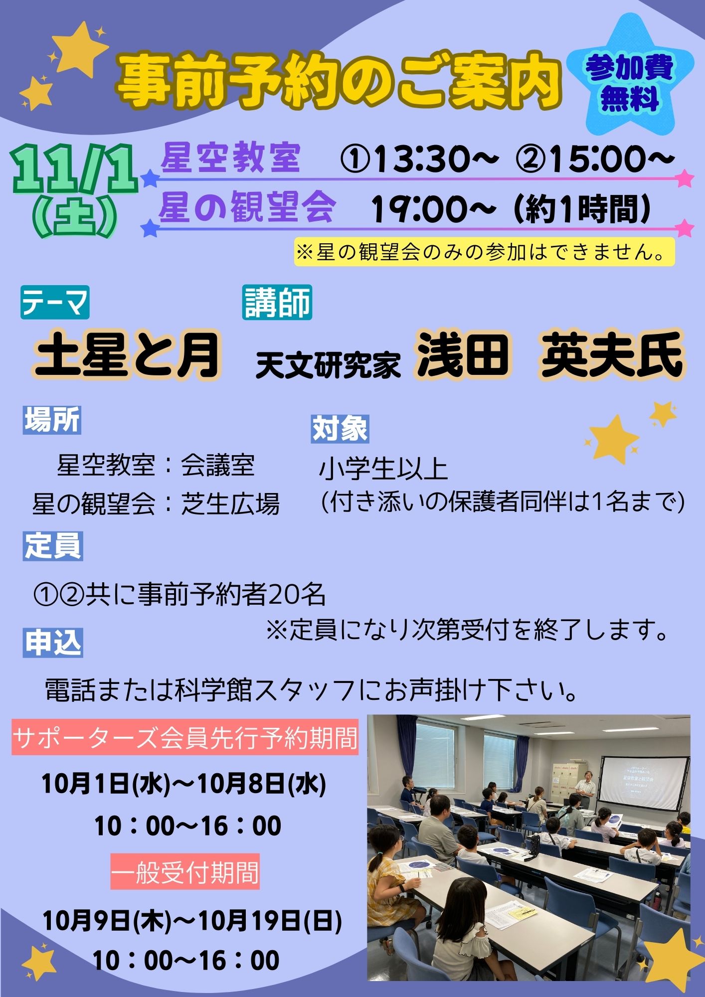 【事前予約のご案内】星空教室 星の観望会◆日時/11月1日(土)星空教室 @13:30〜 A15:00〜星の観望会 19:00〜(約1時間)テーマ:土星と月◆講師/天文研究科 浅田 英夫氏◆参加費/無料◆場所/ 星空教室:会議室 星の観望会:芝生広場◆対象/小学生以上(付き添いの保護者同伴は1名まで)◆定員/事前予約者20名 ※定員になり次第受付を終了します。◆申込/電話または科学館スタッフにお声掛け下さい。サポーターズ会員先行予約期間 10月1日(水)〜10月8日(水)10:00〜16:00一般受付期間 10月9日(木)〜10月19日(日) 10:00〜16:00※星の観望会のみの参加はできません。※詳細はWebページをご確認ください。