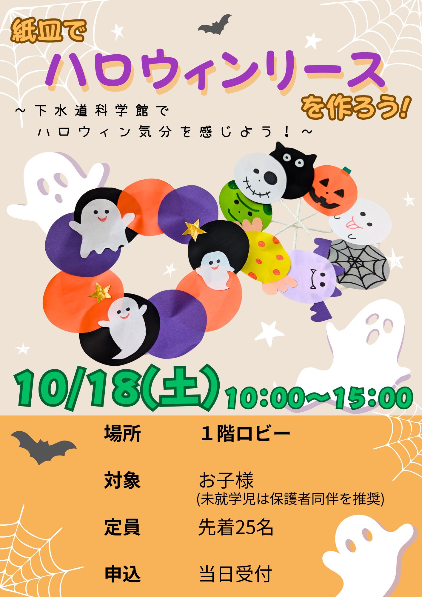 紙皿でハロウィンリースを作ろう!〜下水道科学館でハロウィン気分を感じよう!〜◆日時/10月18日(土)10:00〜15:00◆場所/1階ロビー◆対象/お子様(未就学児は保護者同伴を推奨)◆定員/先着25名◆申込/当日受付
