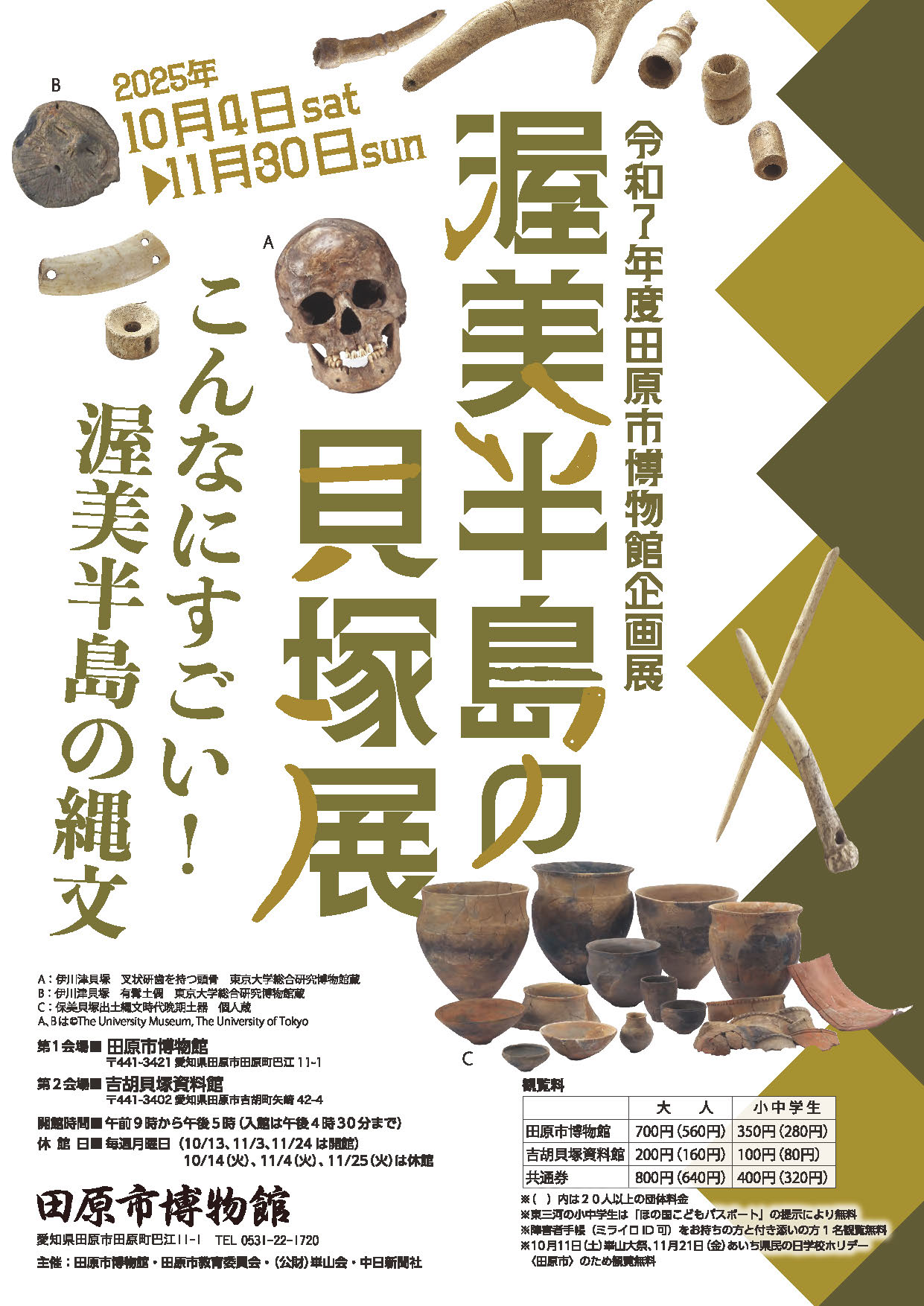 吉胡貝塚資料館(第2会場)との共通券あり。大人800円、小中学生400円