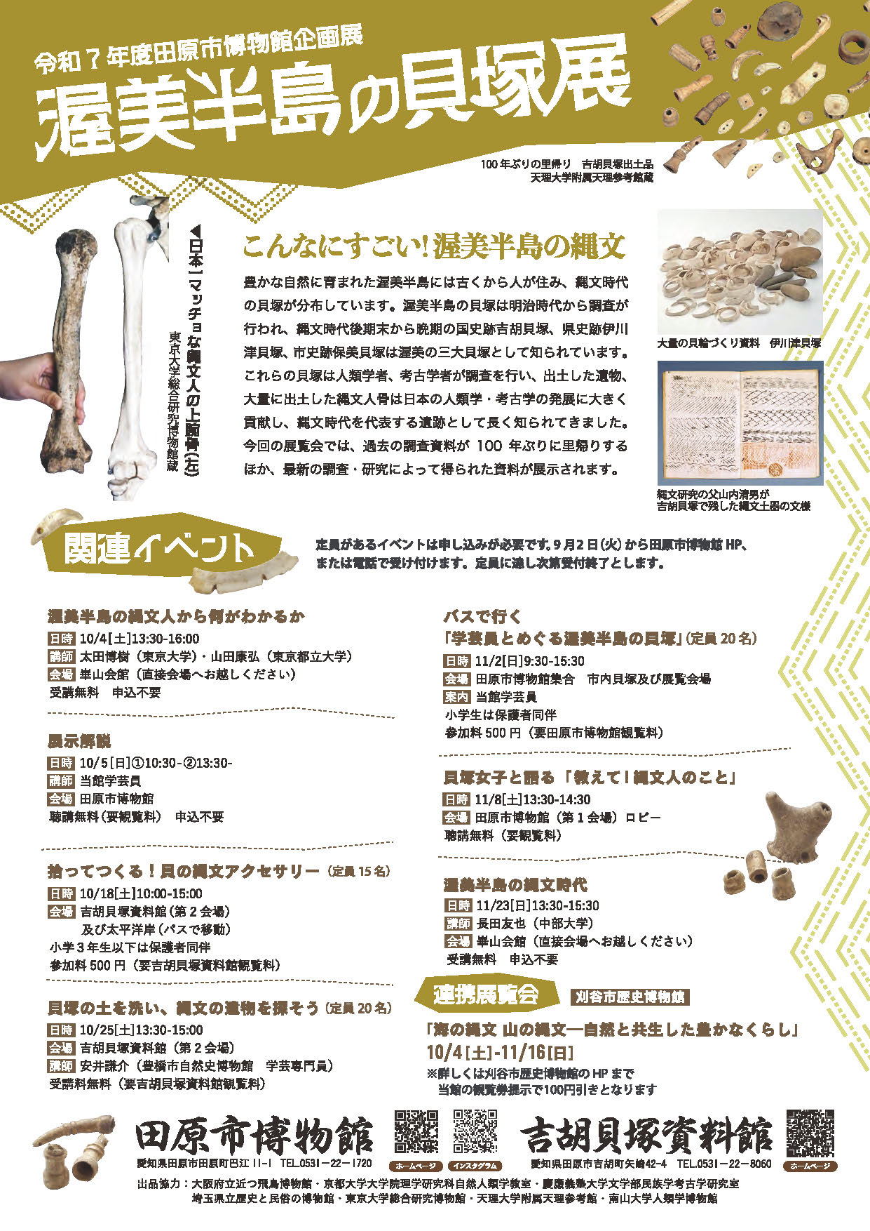 全国的に有名な渥美半島の貝塚。3000年あまり昔の私たちの祖先の生活の知恵や工夫を最新の成果をもとに展示します。日本一のマッチョマン縄文人をはじめ100年ぶりに渥美半島に里帰りする資料もあります。