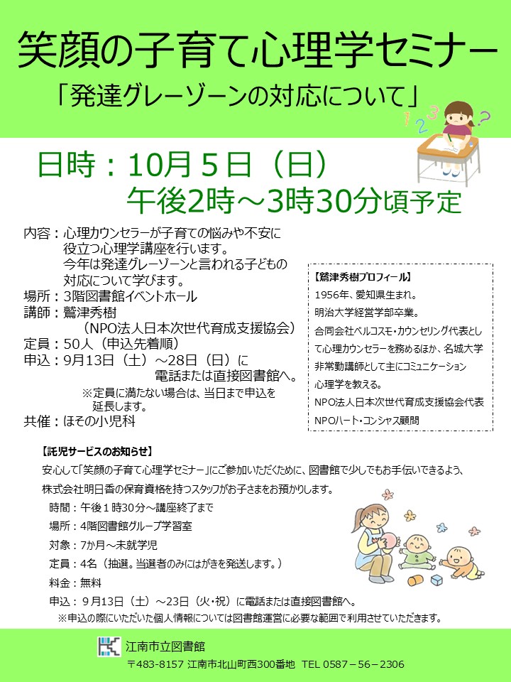 安心して「笑顔の子育て心理学セミナー」にご参加いただくために、図書館で少しでもお手伝いできるよう、