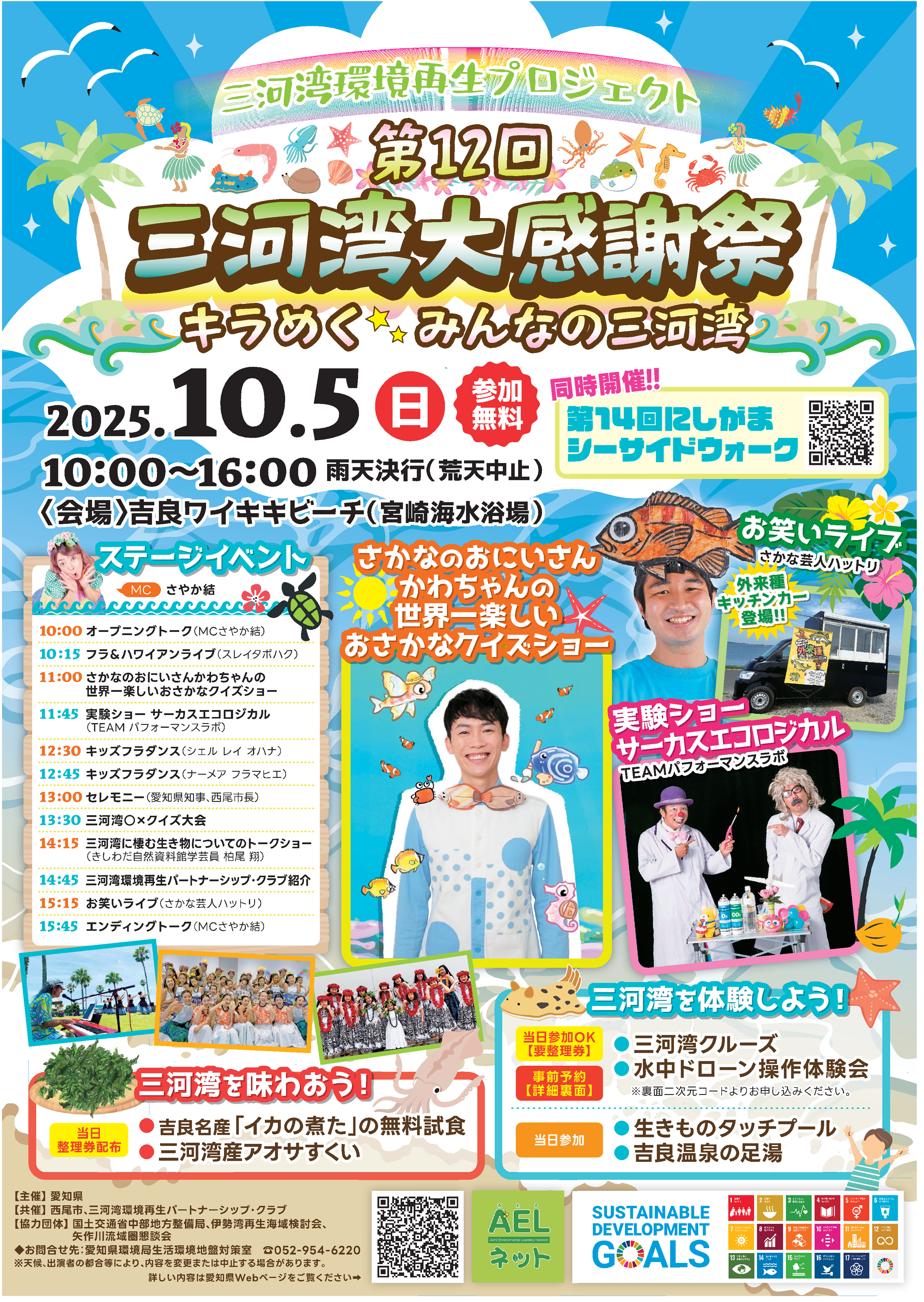 愛知県では、三河湾の再生に向けた取組の機運を高め、多くの県民の皆様に三河湾に関心を持っていただくため、2025年10月5日(日)に、西尾市の吉良ワイキキビーチにおいて、「第12回三河湾大感謝祭」を開催します。今回は、おさかなクイズショー、実験ショー、三河湾クルーズ、水中ドローン操作体験会など、三河湾について触れて楽しんでいただく企画をたくさん用意しています。参加は無料です。是非、お越しください。
