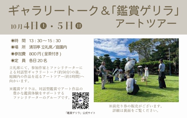 10/4(土)および10/5(日)には、清羽亭立礼席にて対話型ギャラリートーク(約50分)、その後庭園内の作品を巡るアートツアー(約1時間)を実施します。